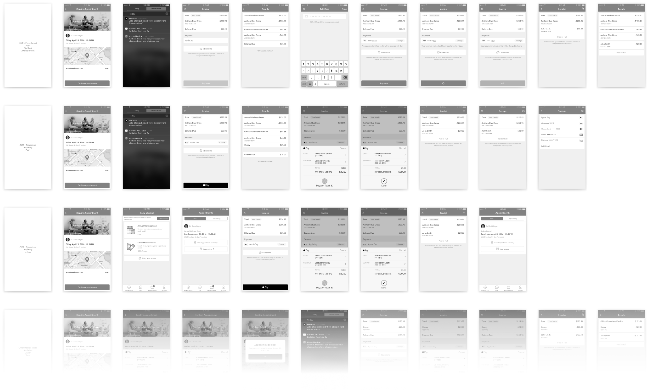 I used wireframes to capture each scenario before user testing. This included push, in-app, and email notifications, authorizing the use of cards for copays and automatic payment processing after appointments, various card types, card management, cancellations, and more.
