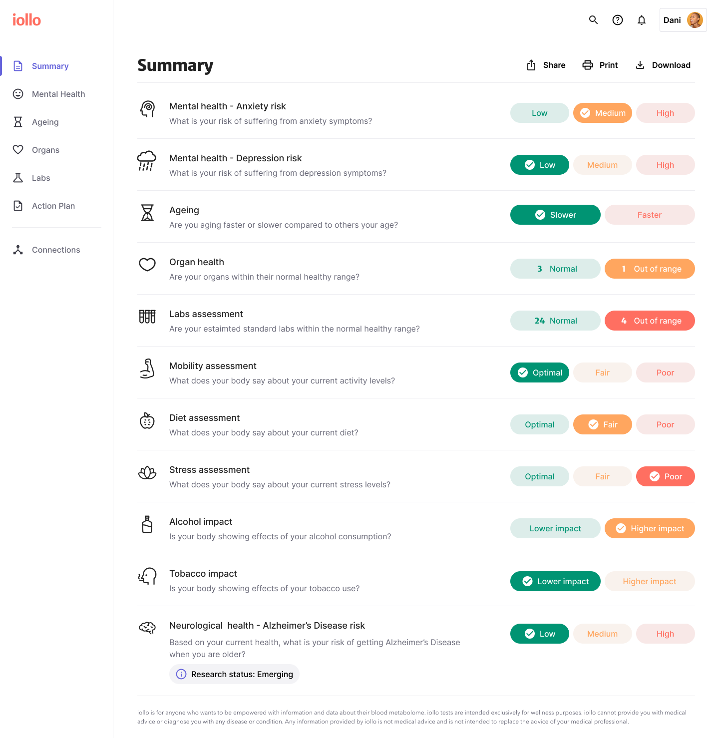 The web app is where subscribers access their results and recommendations and manage their integrations with other health data sources. Aside from the sample collection process, this went through the most cycles of designing, testing, and iterating. Not only was I learning from the users but also using this feedback from users and knowledgable FDA experts to guide the scientific development.