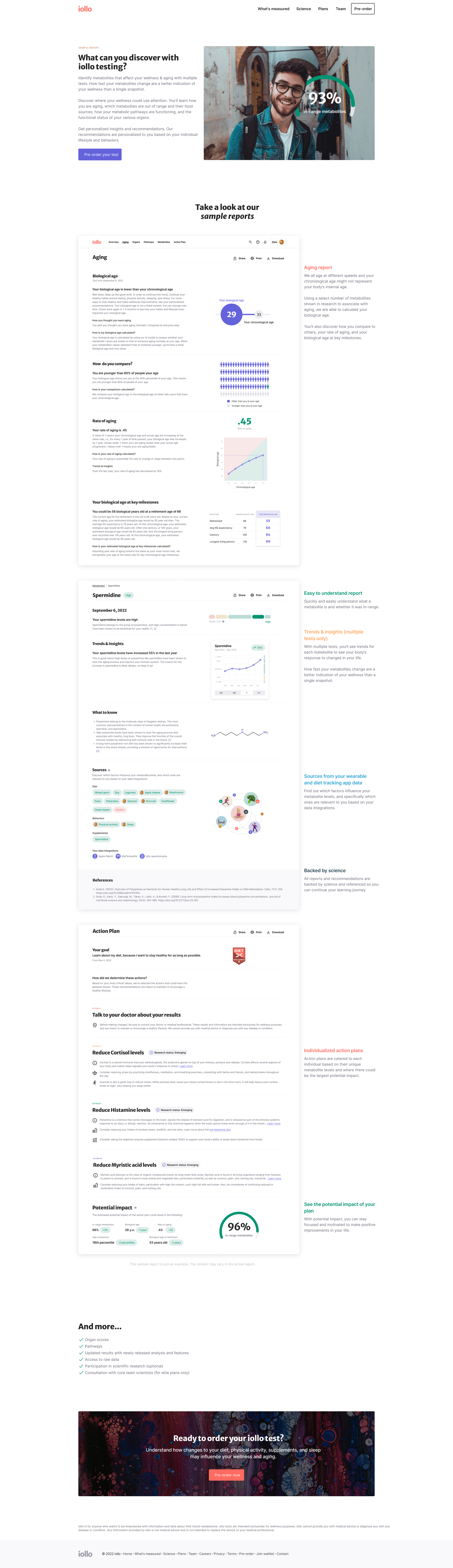 Our landing page communicates what iollo is, how it works, highlights the key features/benefits, provides sneak peaks of the product, provides validation, satisfies legal requirements, provides strong calls-to-action, and pro-actively addresses objections. Each addition to the website was an effort to increase pre-orders with higher conversions.